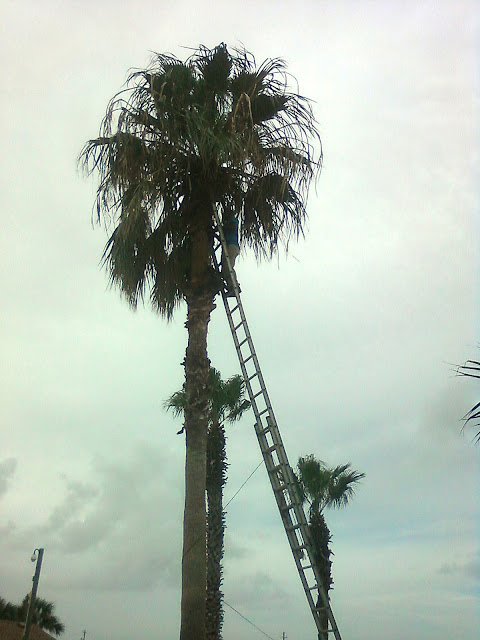 JR arranged for some of our tallest palm trees to be trimmed. This top photo on Saturday shows pretty nice weather. They came back this morning when the winds were up. JR came by and asked them to stop until the wind conditions improved. This is one tough job. There are all kinds of critters in the top of those trees and it's a long way to the ground. Notice the one small rope holding the ladder.